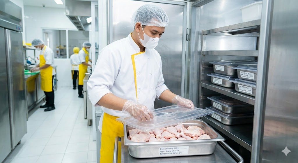 Bahan makanan harus berasal dari sumber yang terpercaya, utuh, dan tidak rusak. Kemasan asli, terdaftar, dan belum kedaluwarsa adalah indikator kualitas yang harus diperhatikan. Selain itu, makanan berisiko tinggi harus selalu ditutup selama penyimpanan dan penyajian untuk menghindari kontaminasi.
