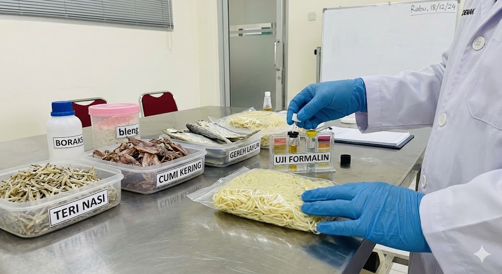 Dari 23 sampel yang diperiksa, ditemukan 6 sampel yang terkontaminasi, yakni mie basah teri nasi kering, cumi kering, gereh( ikan asin) layur , gereh layur kecil mengandung formalin dan bleng mengandung boraks.