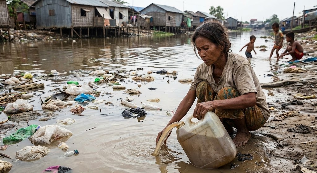 Seorang wanita di daerah pemukiman padat penduduk terpaksa mengambil air dari sungai yang sangat kotor dan dipenuhi sampah plastik untuk kebutuhan sehari-harinya. Pemandangan ini adalah realitas pahit bagi banyak orang di seluruh dunia.