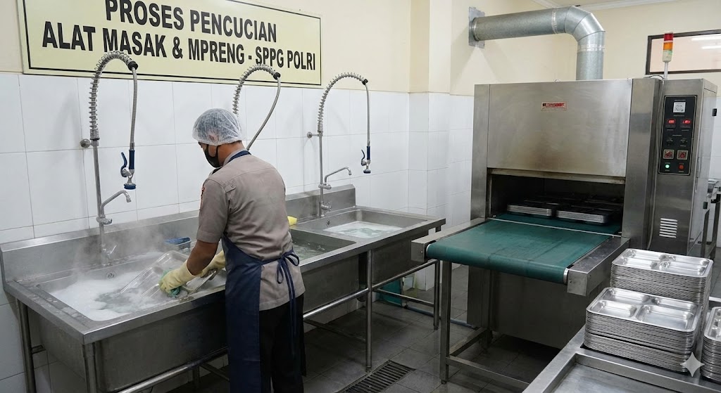 Satuan Pelayanan Pemenuhan Gizi (SPPG) Polri menerapkan standar sanitasi yang ketat demi memastikan program Makan Bergizi Gratis (MBG) aman dan higienis bagi siswa penerima manfaat. Proses pencucian alat masak hingga ompreng atau food tray dilakukan berlapis, mulai dari pembersihan sisa makanan, pencucian dengan tiga tahap, hingga pengeringan menggunakan oven steril.